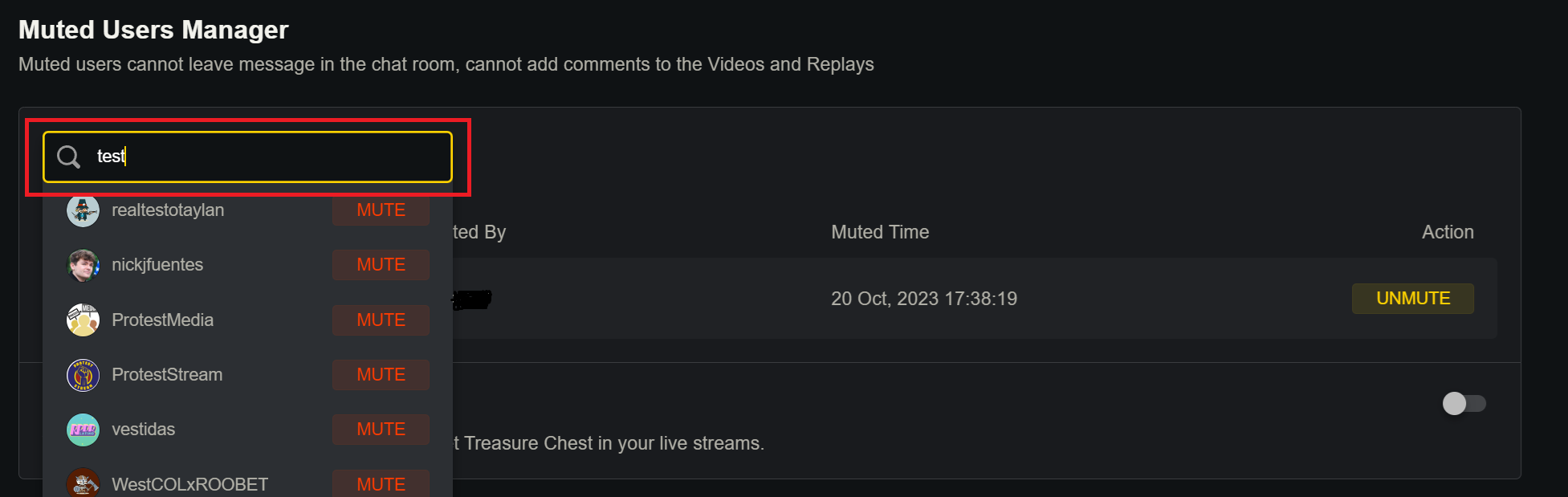 3. Search the username of the user that you want to mute / prevent from redeeming chest rewards, the user doesn't need to have previous chat history to be added into the list.